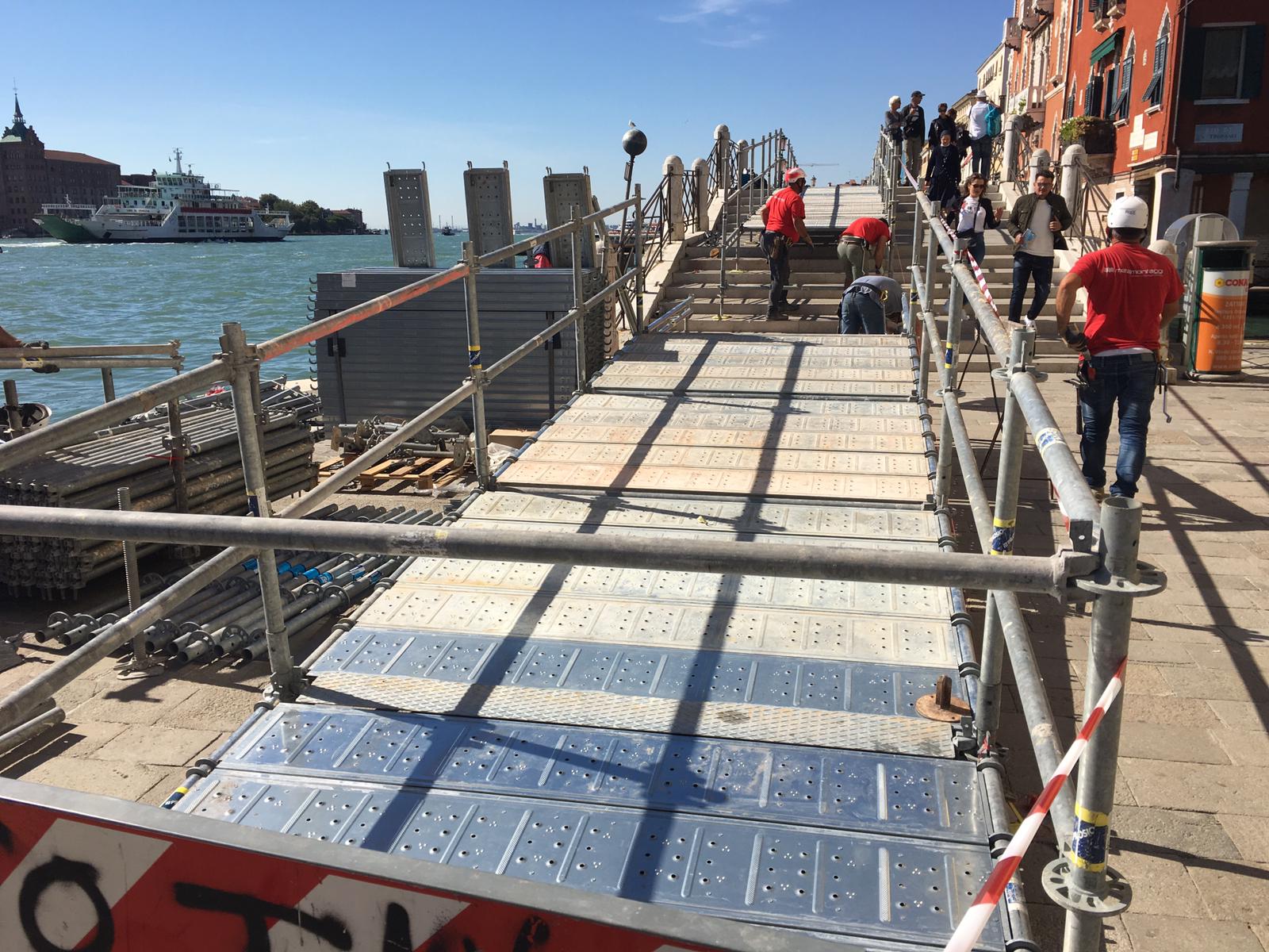 Sono iniziati i lavori di montaggio delle nuove rampe provvisorie in fondamenta delle Zattere. Oggi termineranno i lavori di montaggio delle due rampe sul ponte Longo; domani e venerdì ci si sposterà sul ponte della Calcina, si proseguirà successivamente con il ponte degli Incurabili (lunedì 1 e martedì 2 ottobre) e con ponte di Ca’ Balà (mercoledì 3 e giovedì 4 ottobre). Lunedì 8 e martedì 9 ottobre saranno invece posizionate le rampe sul ponte della Salute, anche in vista della festa della Madonna della Salute.